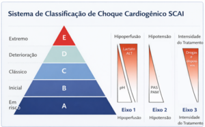 O choque cardiogênico é uma síndrome heterogênea, multifatorial e dinâmica, que não comporta definições binárias (choque vs. não choque). Dessa forma, a Society for Cardiovascular Angiography and Interventions (SCAI) propôs, em 2019, um sistema de estadiamento que reconhece o continuum da gravidade do choque cardiogênico.