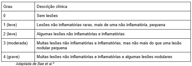 Não há um sistema universal para avaliar a gravidade da acne, mas a escala mais utilizada atualmente, nos EUA, é a Investigator Global Assessment Scale (IGA), que classifica a acne de zero a quatro, de acordo com a presença de lesões não inflamatórias (comedões fechados e abertos) ou inflamatórias (pápulas eritematosas, pústulas e nódulos)2,3.