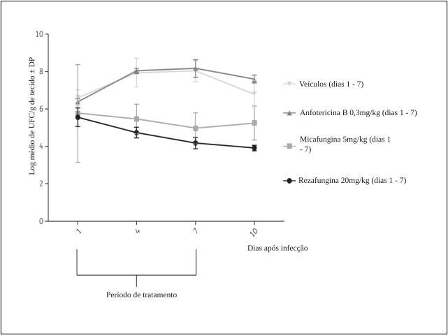 Log médio de UFC/g em tecido renal nos dias 1, 4, 7 e 10, após administração intraperitoneal
