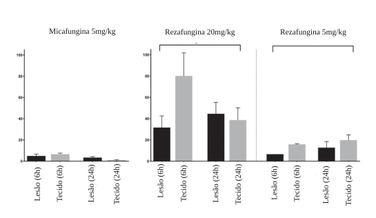 Exposição de micafungina vs. rezafungina, após administração de dose única, em lesões hepáticas e tecidos adjacentes