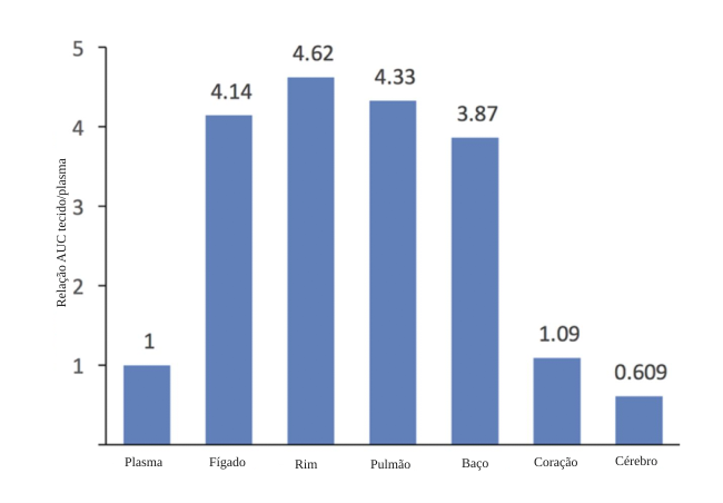Outro estudo de PK/PD, conduzido em ratos, avaliou as razões de concentração tecido/plasma após a administração intravenosa de rezafungina. Os resultados indicaram que, exceto por coração e cérebro, a exposição a essa nova equinocandina foi semelhante em órgãos altamente vascularizados, alcançando razões tecido/plasma de 4 a 5 vezes no fígado, rim, pulmão e baço, demonstrando boa penetração nesses locais.10
