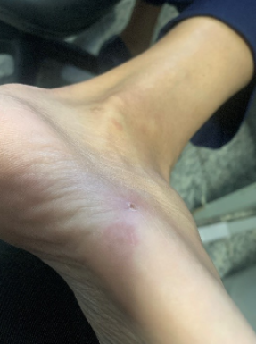 Paciente de 27 anos, médica, vai ao dermatologista com queixa de surgimento de lesão serpiginosa e pruriginosa em pé esquerdo uma semana após retornar de viagem à praia no Nordeste do Brasil. Faz uso de desvenlafaxina para depressão unipolar. Nega outras comorbidades. Nega contato direto com fezes de cães e gatos.