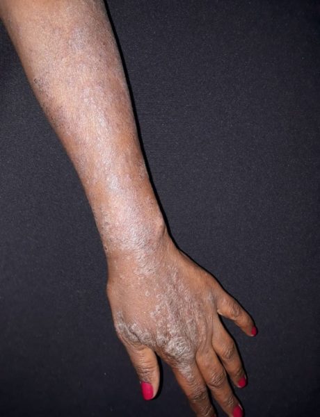 Mulher de 48 anos, auxiliar de serviços gerais, apresenta intenso eczema de mãos e braços nos últimos meses (figura 1), com melhora no período de férias.
