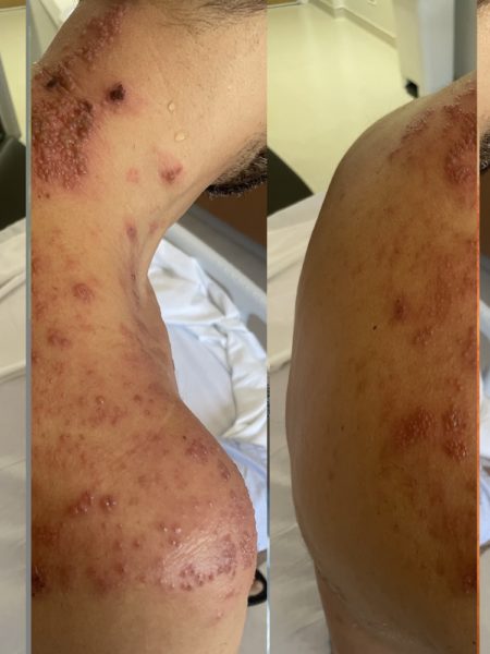 Paciente de 46 anos, previamente hígido, vem ao pronto-socorro com queixa de surgimento de lesões de pele em dorso, ombro e região superior do peitoral maior, todas em dimídio direito há dois dias, com dor associada, e eliminação de secreção hialina pelas vesículas. Ao exame físico: presença de múltiplas lesões, vesículas sobre base eritematosa, com tendência à confluência predominando na lateral da região cervical, se estendendo até o ombro lateralmente e pouco acima do ângulo da escápula inferiormente, chegando até a borda superior do músculo peitoral maior anteriormente. AS lesões respeitam a linha média do tórax e região cervical. Sem outros achados dignos de nota.