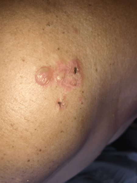 Figuras 1 a 3: erosões em cavidade oral e bolhas flácidas, erosões e crostas na pele (créditos: Dra. Mariana Santino – RJ).