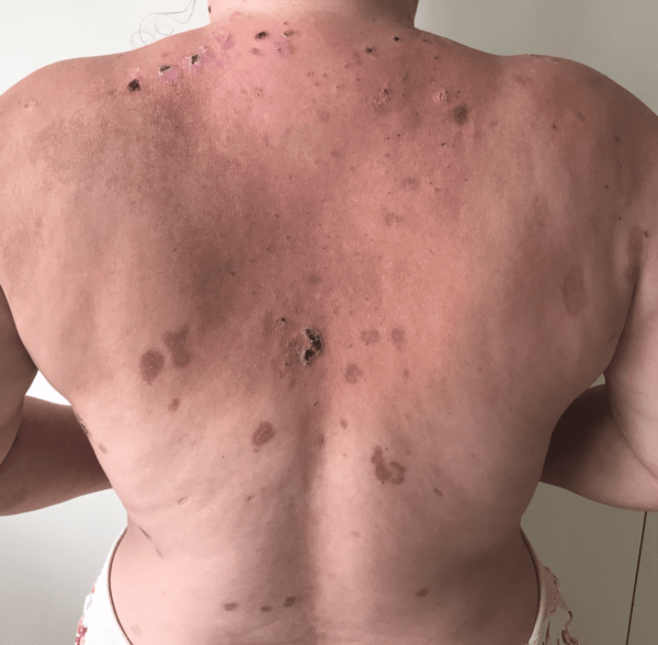 Mulher de 39 anos, hígida, apresentava erosões dolorosas no corpo e na cavidade oral de evolução há meses (figuras 1 a 3). As lesões eram recorrentes e apresentavam melhora parcial com uso de prednisona. Negava uso recente de medicações.