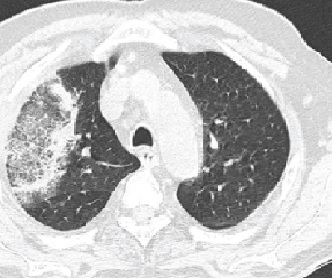 Paciente de 56 anos, submetido a transplante alogênico de medula óssea (TMO) há 45 dias, doador aparentado (irmão 52 anos, hígido), 9/10 (mismatch em DR), comparece ao hospital de referência que o transplantou com quadro de febre persistente de início há cinco dias, com temperatura axilar aferida de 38ºC e hemoptise. Quando questionado, refere tosse produtiva e dor torácica com característica pleurítica. O paciente em questão foi submetido ao TMO após segunda remissão completa de leucemia mieloide aguda, FLT3 positivo na recaída. O esquema de primeira linha utilizado foi o clássico ‘7 + 3’ (Citarabina + Daunorrubicina), enquanto o regime de salvamento foi IDAFLAG + Midostaurina. Como intercorrências durante o tratamento até este momento, o paciente apresentou neutropenia febril com foco em cateter de Hickmann e colite do neutropênico com tratamento eficaz através de antibioticoterapia. Quando recebeu alta do hospital, há 35 dias, não estava mais neutropênico porém manteve uso de ciclosporina como prevenção de doença enxerto-hospedeiro (GVHD). Não estava em uso de antimicrobianos ou antifúngicos profiláticos. Juntamente ao quadro pulmonar, o paciente referia diarreias aquosas em dez episódios ao dia com relato de muco, tendo sido feito o diagnóstico de GVHD agudo intestinal. Solicitado então tomografia de tórax com a imagem abaixo.
