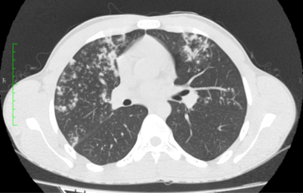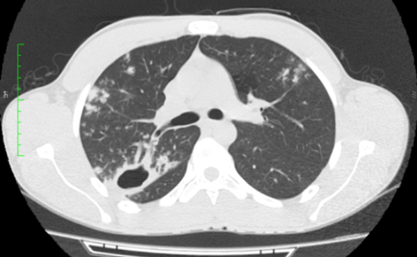 Paciente sexo masculino, 18 anos, sem comorbidades, com quadro arrastado de febre e perda ponderal há cerca de três meses. Foi realizado radiografia de tórax (não disponibilizada), com laudo inconclusivo. Optou-se por prosseguir investigação com tomografia computadorizada do tórax.